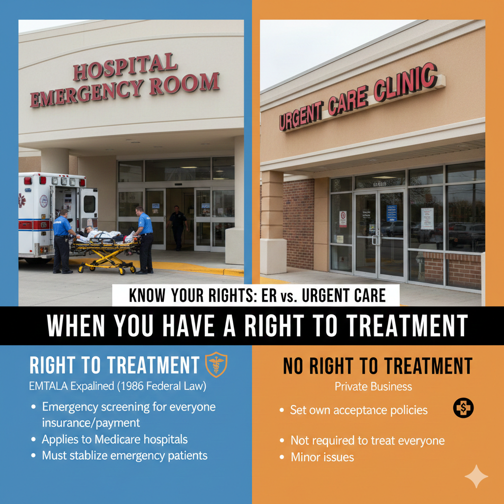 Urgent care centers face no legal obligation to treat every patient. Hospital ERs must comply with EMTALA requirements. This creates a significant legal distinction between facilities.