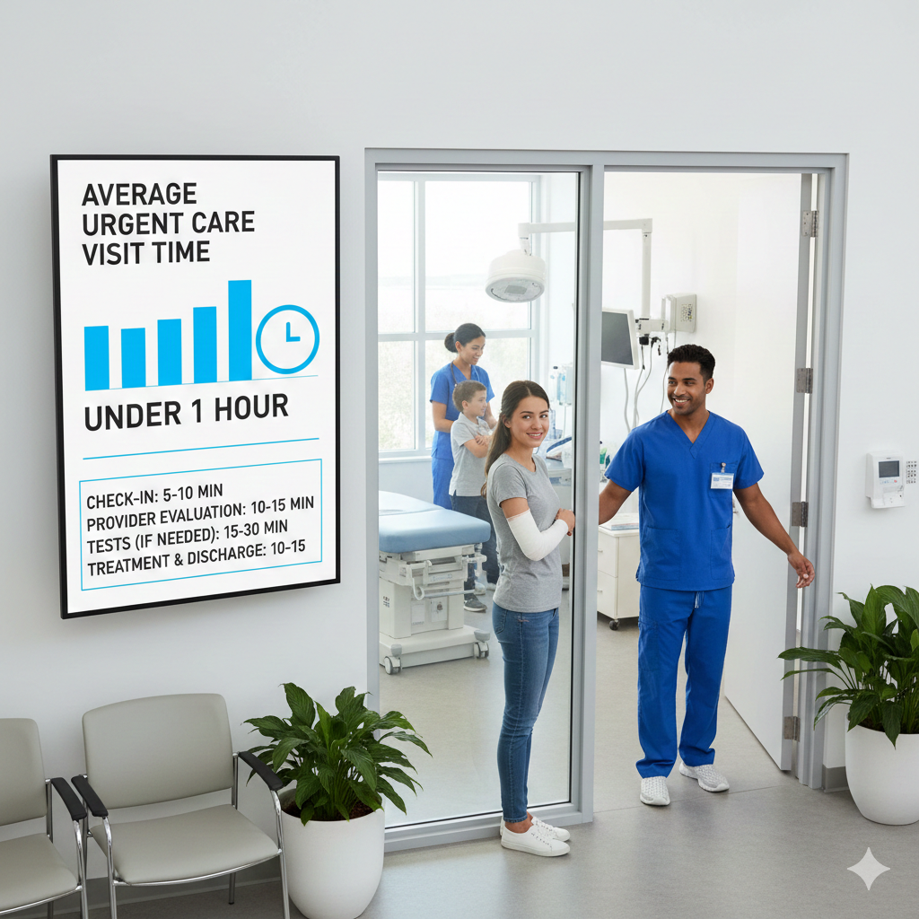 Most urgent care visits complete within 30 to 60 minutes total. Wait times average under 20 minutes at well-run clinics. Costs run significantly lower than emergency room visits.